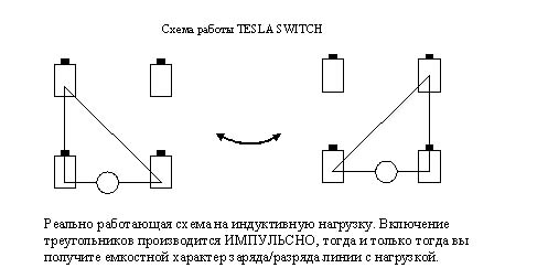 Р.S. Возможно вы имели в виду это: "Организуется разряд двух последовательно соединенных аккумуляторов НА два соединенные параллельно. Затем те аккум. которые соединили параллельно соединяем последовательно, а другие наоборот. Делаем это с частотой приблизительно 500-1000 герц. Получаем переменный ЕМКОСТНОЙ ток по одному незаземленному проводу. В качестве нагрузки используем индуктивность. Уже при данной частоте при условии присутствия противоЭДС параллельно включенных аккумуляторов, ток проводимости возникнуть не может. Но "бегущая волна" (плохо выразился но как умею) отражаясь от конца линии и возвращаясь обратно вызывает движение свободных (в смысле электронного газа металла из которого состоит провод, в данном случае медь) электронов в проводнике. Аккумуляторы имеют равный вольтаж и емкость. Аккумуляторы не разряжаются потому, что мы используем их именно как емкости, не замыкая цепи плюс минус."