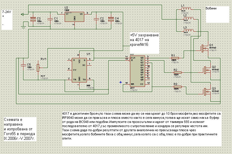 во второй схеме вместо 555 таймера лучше воткнуть чё-нить типа к561ла7 (импульсы пойдут также как и с 555-ой на 14 ногу 4017-ой). 15 нога микрохи 4017 должна соединяться не с 4, а с 7-ой. Данный генератор собран и работает, только напряжение питания должно находиться в пределах 9-15 В, на меньшем наблюдаются глюки в виде нарушения очередности переключения фаз. И резюки в затворах полевика надо поднять до 1-2 кОм, т.к. тут не 5В ТТЛ'а будет а все 9-15 практически КМОПовских.