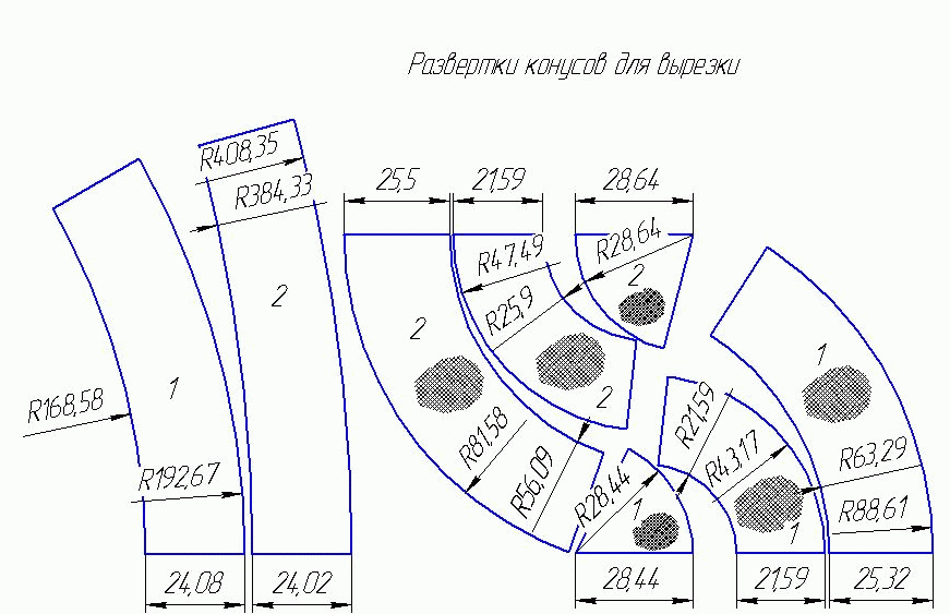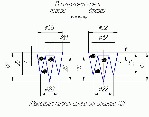Чертежи kondr выложил правильные (это все видно в видео интервью), но я обратил внимание на другое - если повнимательней посмотреть (перевести видео в другой формат, увеличить и разложить по кадрам) то видно что в руках у Гончарова конструкция несколько отличаеться от чертежей лежащих на столе, а именно - на чертежах - 3 конуса из сетки , а у него 2!!! Я пробовал спаять 3 конуса, но пайка (швы) слишком перекрывают сечение диффузоров - очень все миниатюрно.