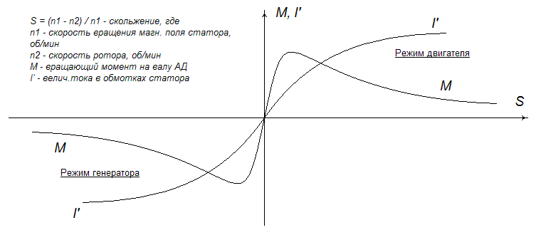 Вообще тема интересная для изучения. Характеристика асинхронника (вращ.мом.от скольжения) проходит через ноль и симметричная. То есть в режиме генерации, когда скольжение отрицательно, противодействующий момент внешнему приводу со стороны ротора увеличивается только до определенного момента. После достижения М(макс) - уже снижается. Но не генерируемый ток. Вопрос в том сдюжат ли обмотки, если не у обычного, то хотя бы у АД с фазным ротором, которые вроде бы рассчитывают на эксплуатацию с заклиненным ротором (то ли в качестве транса, то ли ещё чего, может кто в курсе).