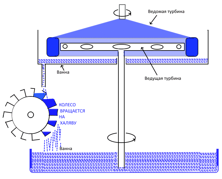 Но это не в тему здесь,здесь у нас центрофига-гидромуфта-ротовертер-ГЭС на кону. Ведущая турбина выбрасывает воду через сопла против направления своего вращения на лопатки ведомой она после этого так же через сопла выкидывает воду но уже по направлению своего вращения (а для этого,как понимаете нужно какое то расстояние радиуса для создания под действием ЦБС давления в ведомой турбине,) которая через повышающую передачу вращает ведущую