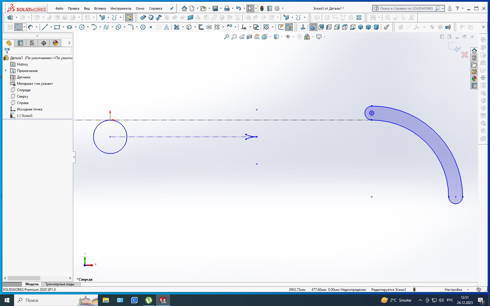 …. а по центру дуги по которой движется тело привязанное к веревке.