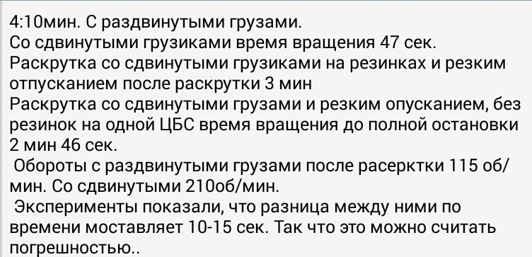2. - кроме этого есть трение и думаю, не малое, как раз в состоянии придвинутых к оси грузиков. Это приводит и к быстрой остановке вертушки в этом положении и к меньшей частоты вращения в самом начале. Ты измерил время до останова в положении, когда грузики находятся вблизи оси и привязаны, без действия твоих рук? Руками надо разгонять вертушку до нужных оборотов.
