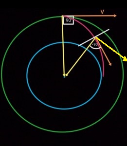 , чтобы объяснить несуществующее тангенциальное ускорение. Это ускорение существует только в ошибочных рассчётах. А в реальности ни какого тангенциального ускорения нет и быть не может, как нет и тангенциалього замедления при раздвижении грузов. А если мы применим спиральную теорию к раздвижению грузов то получится, что при раздвижениии они тоже должны ускоряться так как угол там больше чем 90° А замедление может быть, только если угол острый.