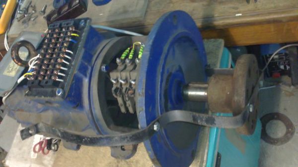 Сперва просто убедился в работоспособности самого мотора- накоротко замкнул выводы щеточных колец ротора, и подал трехфазное напряжение с частотника на статорные обмотки, соединенные в треугольник. Мотор плавно, с характерным низким звуком работающего крана, запустился и стал набирать обороты. Потом несколько видоизменил выходные соединения- три фазы с ротора направил сперва на выпрямитель, а потом уже, после выпрямления, замкнул накоротко амперметром постоянного тока. Мотор запустился и работал без изменений.