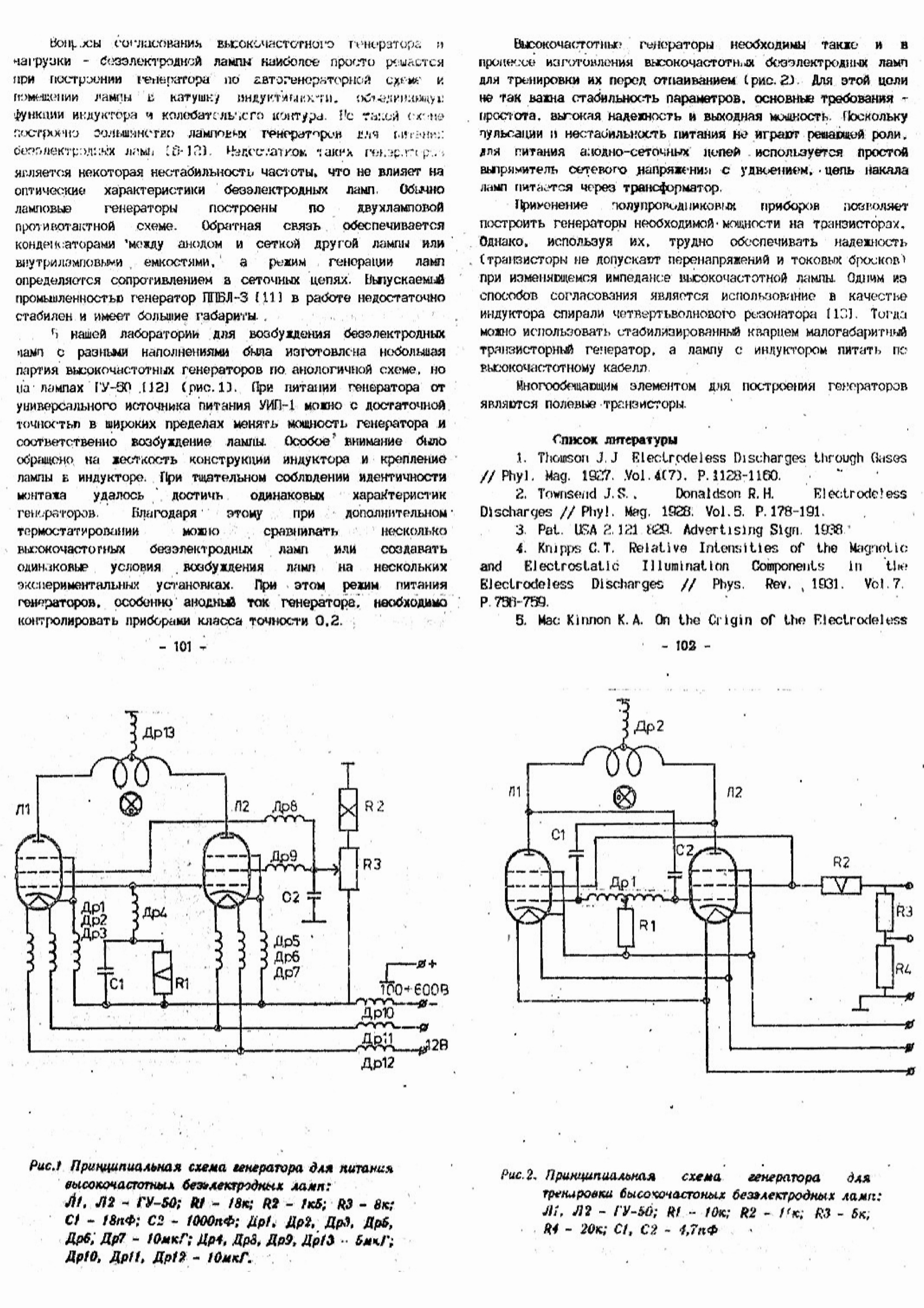 - очень хорошо экранированный, в металлическом корпусе, автогенератор на двух тетродах на частоту около 100 МГц, нагруженный на катушки, в которые вносятся лампы ВСБ или неонки для генерации индуктивно связанной плазмы. ППБЛ-3М (Разряд)