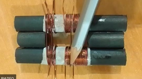 Фильма №2 на 17:00. Выходная катушка включена встречно на магнитопровод с запасом индукции по напряжённости. В верхнюю можно либо резистор переменный вставить, либо переменным током накачивать нижнюю катушку. Ниччо интересного..