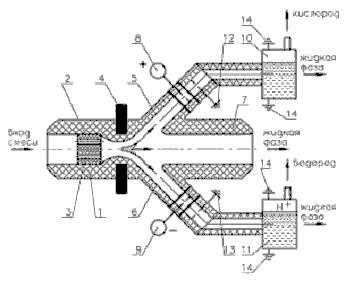 Предложенное Колдамасовым А.И. с сотрудниками устройство для получения водорода содержит корпус 1, выполненный из диэлектрического материала, стойкого к кавитационной эмиссии тепловым воздействиям, например, из кера-мики или сапфира с установленной в нем вставкой 2, изготовленной из диэлек-трического материала, например, асбоцемента или фторопласта, склонного к ка-витационной эмиссии и выполненными в ней одним или несколькими отвер-стиями 3, представляющими собой цилиндрические каналы длиной 25-30 мм и диаметром 1-2 мм. На корпусе 1 установлены, по меньшей мере, два магнита 4, которые могут быть постоянными или индуктивными. За магнитами 4 для при-нятия потоков сформированы патрубки 5, 6 и 7, причем патрубки 5 и 6 электри-чески изолированы друг от друга. При этом патрубки 5 и 6 несут ионизирован-ные потоки отрицательного потенциала и положительного соответственно, а патрубок 7 несет нейтральный поток. За патрубком 5 корпуса 1 установлен управляющий электрод 8, а за патрубком 6 корпуса 1 – управляющий электрод 9. Для приведения ионизированных потоков в стабильное состояние установлены коллиматоры 10 и 11. По пути следования потоков за управляющими электрода-ми 8 и 9 установлены контакторы 12 и 13 соответственно, обеспечивающие за-земление ионизированных потоков. Коллиматоры 10 и 11 заземлены с помощью контакторов 14.