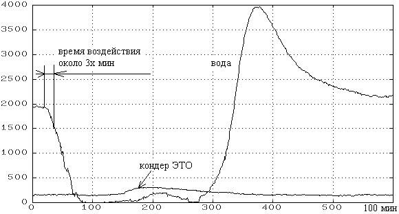 Чувствительность воды к полю оказалась на 1.5 - 2 порядка выше. Поэтому время воздействия пришлось уменьшить до нескольких минут. После того, как убрал поле, в воде долго продолжаются процессы. Весь график занимает по времени 100 мин.