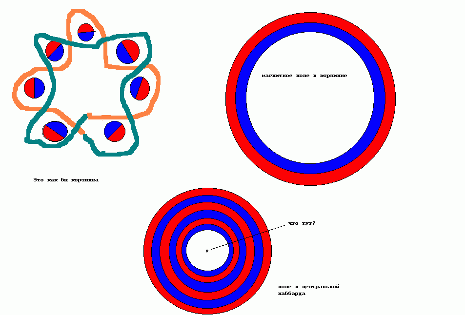 Помнится корзинки намотаны проводом в цветной изоляции.Также , если память не изменяет корзинка это три катушки. Тогда поле в корзинке может выглядеть так. А у хаббарда? Такого поля не получится . Что скажете? Или все три катушки в корзинке дают намагниченность как постом выше?