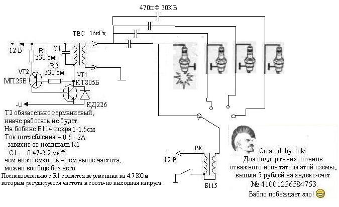 loiki, то я что-то напутал. По картинке действительно ничего сложного. Необходим фанатический энтузиазм для реализации этого, т.к. здоровый энтузиазм пока сомневается в эффективной ионизации всей камеры сгорания двумя электродами с зазором 0,75-0,8 мм. С этой идеей надо "переспать". 😀 А так, на час работы.
