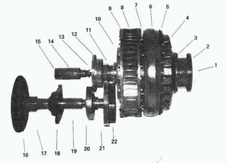 Если на снимке детали 20 и 22 являются шестерёнками (колёсиками) и предназначены для того чтобы передавать часть энергий выработанной внешним колесом на вращение внутреннего,по соотношению диаметров как раз вроде бы похоже как будто вращающееся с большей скоростью внешнее колесо передаёт через понижающую передачу вращение на внутреннее.С направлениями вращения в одну сторону тоже сходится. Предварительная раскрутка через вал 15.Насчёт сопел.Кто знает,может и внутри также можно использовать лопатки или спиральную трубку как у ,главное чтобы они обеспечивали направление вылетевшей струи по ходу вращения и создание давления от центробежных сил.