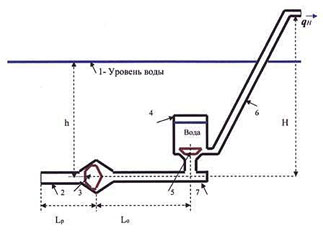 Прошу прощения не пояснил. В начальный момент клапан 1 (показан пластинкой на нижнем торце трубы) закрыт , в системе присутствует воздух с атмосферным давлением. Затем открываем нижний клапан 1, вода начинает подниматься по трубе (со скоростью зависящей от давления, которое зависит от глубины погружения 😀 ). Затем закрываем клапан 1, столб воды захочет двигаться по инерции :!: , чтобы не мешать ему это делать приделанна труба с клапаном, она подводит воздух из атмосферы и столб жидкости преодолевая силу тяжести выплюхивается наверх, и "водоплюй" снова готов к работе!
