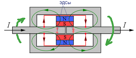 Это разрез цилиндра по оси. Берем чертеж двумя руками и крутим вокруг горизонтальной оси, по которой протекает ток. Описанные фигуры вращения воплощаем в железе. Серое это железо, красное медь, зеленые магнитные силовые линии. Это вообще-то обычный униполярник, разница только в том, что щетки прикладываются к оси, а не к ободу, и потерь на трение будет меньше. Еще интересен он тем, что можно весь ротор целиком сделать монолитным. Гм, а куда в таком случае приложен момент реакции?