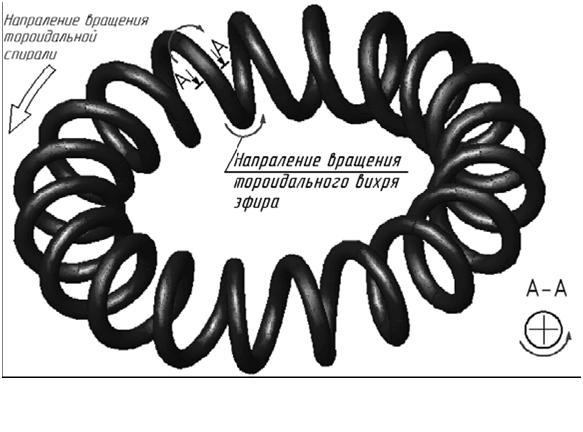Вращающиеся спираль будет создавать в окружающем эфире два потока: кольцевой поток эфира вокруг спирали и тороидальный поток эфира по спирали, который будет выдуваться через центральное отверстие в виде закрученного вихря. При большой скорости вращения можно рассматривать вращающуюся спираль, как полный аналог газового винтового тороидального вихря.
