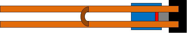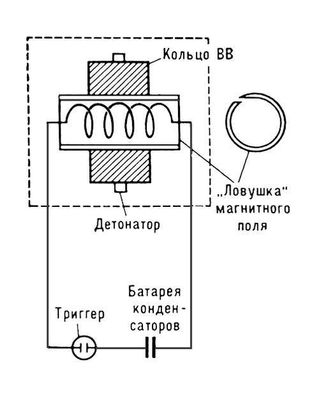 Заряд пороха (серый) разгоняет маленькую "пульку" из проводника (красная). В начале пулька находится между 2 магнитов (один-синий, второй - не показан, ибо загородит снаряд).