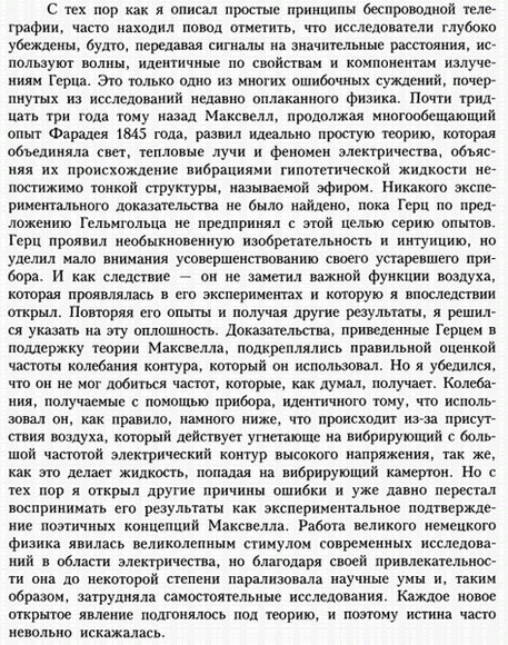 «Звук» в эфире, или по другому ультразвук, сейчас мы называем электромагнитными волнами или по другому ещё Тесла называл – волны Герца. Вот что по поводу опытов Герца сам Н.Тесла говорит: