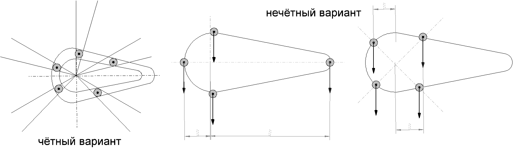 Дело в том, что пока система статична и не имеет внешних ограничителей, то указанные силы соответствуют тем, что на схеме. Но если вынуждать грузики двигаться по указанной траектории, применив некий трафарет с вырезанной траекторией, то силы будут совершенно иными. Если быть точным, то нас больше интересуют не силы, а их момент на валу ротора. И вот тут возникает неприятность - чем меньше угол между траекторией груза и вектором гравитации, тем меньше сила, воздействующая на ротор в нужном направлении. Правая сторона будет "ослаблена" из-за пологой траектории в неподвижном трафарете.