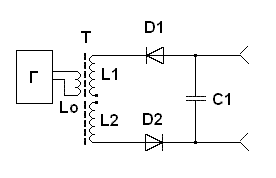 ...В этой схеме уже имеются две одинаковые вторичные обмотки L1 и L2, у которых по одному концу оставлены свободными, а вторые концы соединены, соответственно, с диодами D1 и D2, с которых энергия в виде электрических зарядов накапливается на конденсаторе C1, с обкладок которого их можно направить в нагрузку в виде электрического тока. И как в классической схеме Авраменко выход максимальной мощности в нагрузку возможен при частоте генератора Г, равной частоте резонанса контура L1C1 или L2C1. Разомкнутость контура L1-D1-C1-D2-L2 обеспечивает режим сверхпроводимости."