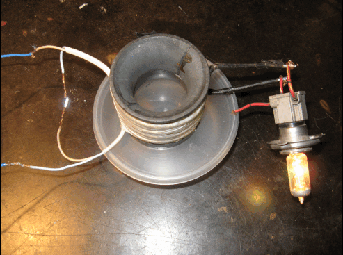 На электроды подавалось напряжение от кинескопа монитора. Катушка приводилась во вращение электродрелью. Лампочка так и не загорелась. 😕