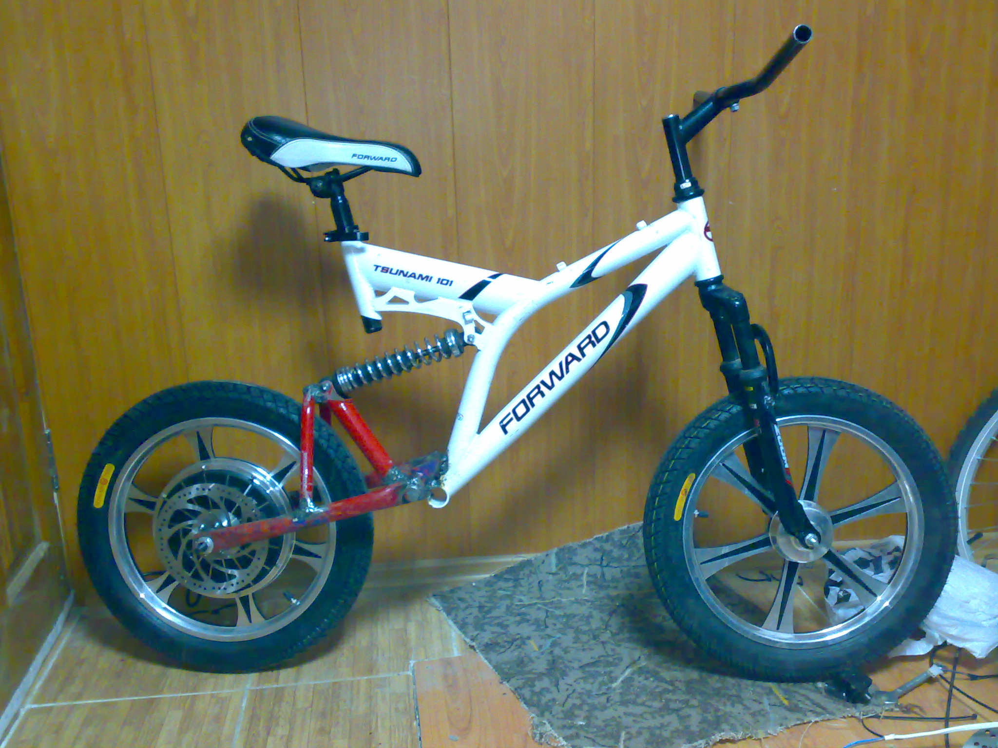 затем преобрел велик FORVARD TSUNAMI 101? ну это не принципиально я остановился на том что он двухподвес и цена 5000р. вообщем проверил его на 3-х акумуляторах по 12 в скорость порядка 30 км-ч колеса 24 дюйма. вот фото второй версии