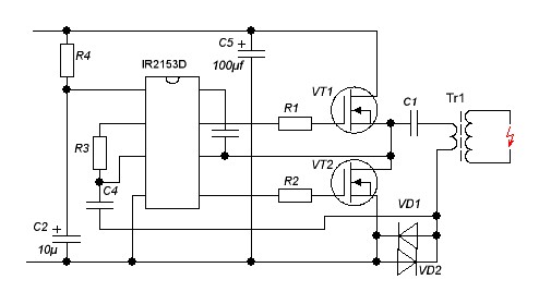 Тада буду по этой схеме издеваться, тем более она у меня собрана и даже работала, осталось тока найти где валяется. На катушке от бензопилы дружба 10см дугу держала, при сближении провода плавились, ток потребления 2,5А.