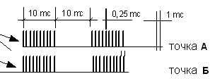 Мои результаты вот:после сборки схемы у меня получается на точках А и Б одинаковые импульсы без смещений по 5 штакетин в каждом. Длительность импульса 5ms период 1ms.