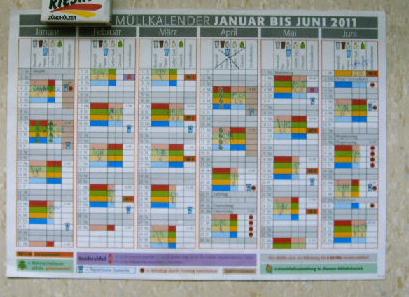 вот такой график приходит в каждую квартиру в начале года. Согласно ему квартиросьёмщик выносит свой мусор по определлённым дням, причём, если это упаковка из пластика то она должна быть чистой, если это стекло то оно должно быть без метала. Каждый мусор пакуется именно в свой мешок. К примеру- бумага только в мешок с надписью - /папир/. Картон должен быть упакован ОТДЕЛЬНО от бумаги. Отработанные батарейки собираются в специальные контейнеры !!!