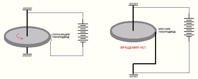 для наглядности картинка, где видно, что в обоих случаях путь тока абсолютно одинаков, но только схема со скользящим контактом именно на край диска дает вращение...