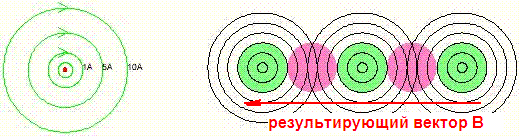 Однако, если предположить "черезвитковую" намотку трансформатора (как бифиляр, но две разные обмотки) - то по вышеописанному принципу трансформатор работать не должен, ибо получается, что проводник вторички (красный) будет пересекаться полями от соседних витков первички (зеленая) во взаимно противоположных направлениях - по рисунку, от соседнего проводника справа поле движется справа-налево, от другого соседнего проводника - слева направо.