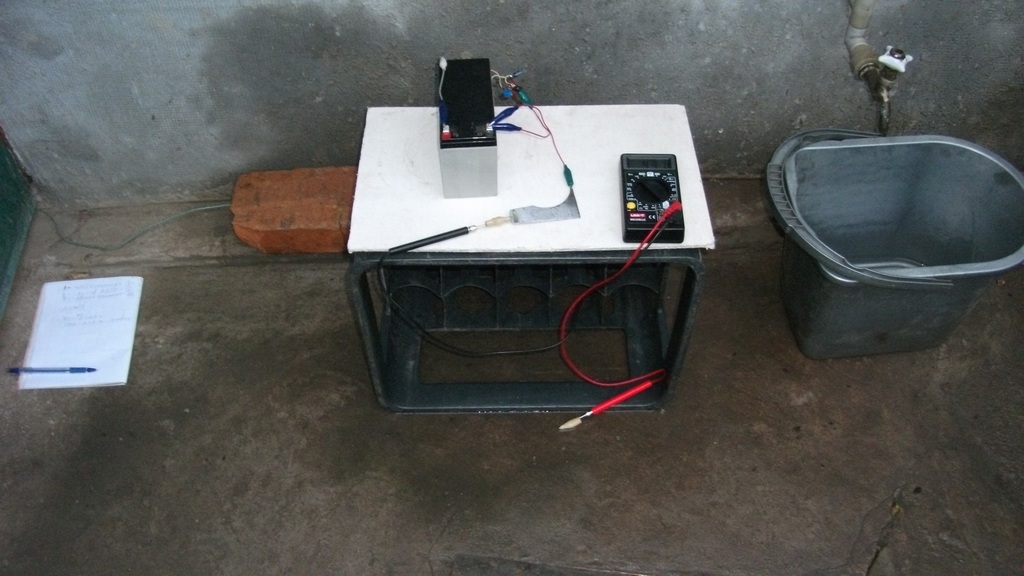 По "многочисленным"😊, просьбам "трудящихся"😊. Сего - дня😊, был произведён пробный пуск "Челленджера"😊, в условиях - максимально приближенным к "боевым"😊. То есть - на улице, погода сырая, временами моросит мелкий дождик. "Автомобиль"😊, был собран из "подручных средств". "Кузовом" - служил небольшой отрезок "железия" - толщиной 1-1,2 мм, тщательно очищенный от краски, при помощи наждачной "шкурки"😊. "Колёсами" - пластиковый ящик, с уложенным на него куском магнезитовой плиты. Источником "первичного электропитания"😊 - АКБ от "бесперебойника". В качестве "истошника" повышенного напряжения, для КАТОДНОЙ "защиты" кузова "автомобиля" - был применён собранный "криворуко и кособоко", блокинг генератор, "запустившийся" приблизительно на 60 - 80 кГц и "умеющий" плавно изменять выходное напряжение от 60 В и до ???, в данном слуЧае я "выставил" - 100 В (приблизительно). "Метёлкой" - служил штырь из нержавеющей трубки длиной - 1000 мм и диаметром - 10 мм забитый в в планету Земля и выполняющий в домашнем хозяйстве роль "контура заземления" для душевого "бокса"😊. В качестве "дороги" - использовалось бетонное покрытие двора, сырое от дождика😎 .