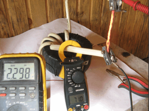 Для проверки влияния противо ЭДС я собрал автономный стенд. Для этого взял аккумулятор, амперметр, инвертор на 600вт с 12в на 220в подал на трансформатор, нагрузил на скрученную спираль из нихрома, которую видно на следующем фото. В данном опыте потребляемая мощность от источника была 40вт, на нагрузке при напряжении 2,3в выделилось 163вт. Данные опыты показываю впервые.