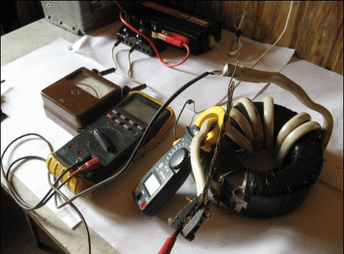 Это фото показывает, что трансформатор реально работает на нагрузку от автономного источника, это показывают измерительные приборы.