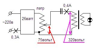 Молодец,схема нарисована правильно! А теперь удвой емкость конденсатора - напряжение на конденсаторах и на входе трансформатора останутся без изменения! А это значит,что сила тока увеличилась в два раза! А затем можеш еще в два раза - в общем пределов нет!