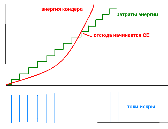 А арифметика простая: если при энергии потерь = 50*Е-6дЖ и зарядной ёмкости =10000пФ, при 100 зарядных импульсах напряжение на кондёре поднимется до 1000В, то КПД будет = 100%. А если поднимется выше, то тогда и начинается СЕ.