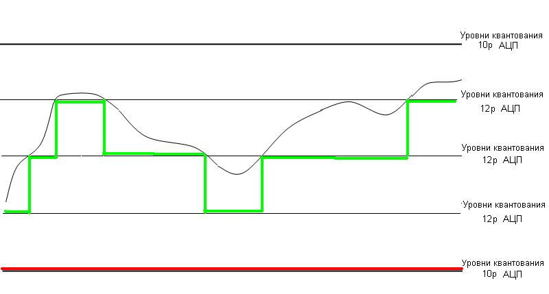 Вот посмотрите на рисунок. Зелёным цветом - результат квантования 12 разрядного АЦП, красным цветом – 10 разрядного АЦП. Уровень измеряемого сигнала меняется в течении минуты в районе точности 12 разрядного АЦП. И 12 разрядный АЦП безусловно обнаружил бы изменение уровня сигнала на 3 дискрета.
