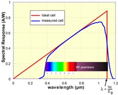 Так не поймешь. У каждого фотоэлемента свой спектр поглощения, там куча резонансов, которые зависят от типа примесей, толщины p-n перехода, от концентрации примесей и прочего.