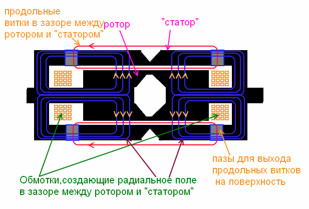 Вот почему только в отверстиях для выхода проводов наружу тоже есть магнитное поле когда ему путь гораздо легче в обход этих пазов по сплошному металлу имеется? Вот и не мешало бы попробовать ротор сделать свободно вращающимся относительно статора оставив все витки на статоре.Но некогда...