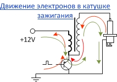 Так и в катушке зажигания: ток в первичке передает через магнитное поле усилие на вторичку, в которой начинают двигаться электроны и выдавливаться на одном ее конце. Если вторичный контур замкнут, то электроны проходят на второй конец вторички.