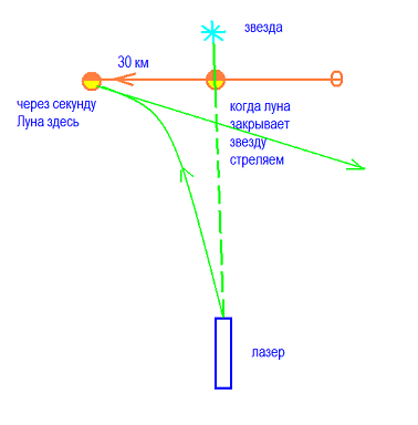Луч летит прямо к луне и к звезде, на которую нацелились.
