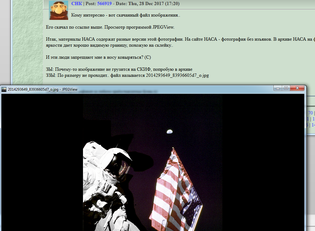 Итак, материалы НАСА содержат разные версии этой фотографии. На сайте НАСА - фотография без изъянов. В архиве НАСА на фликре - та самая фотография, где увеличение яркости дает хорошо видимую границу, похожую на склейку..