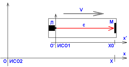 Система "ИСО1" движется относительно системы "ИСО2" со скоростью "V"=150000 км/с по направлению лазерного луча.