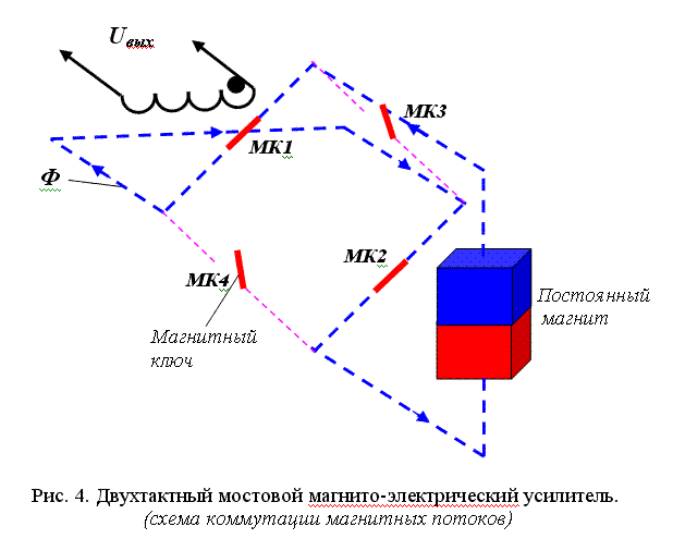 Существует возможность построения двухтактных мостовых магнито-электрических усилителей Рис. 4, имеющих удвоенный «размах» амплитуды изменения магнитного потока, что иногда может оказаться полезным.