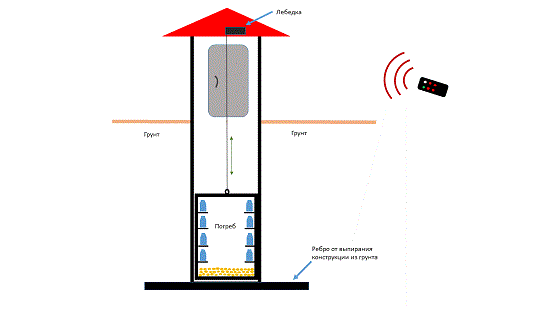 Идея проста, сделать хранилище продуктов с максимально комфортным доступом к ним не нарушая условия хранения. Это выдвижной из шахты погреб, Вам стоит нажать на пульте управления кнопку и лифт с продуктами поднимается перед Вами, открыв дверь Вы видите витрину как в магазине с продуктами. Ненужно таскать мешки и ящики, а просто взял продуктов столько сколько необходимо для приготовления блюд на один раз или на весь день. Можно установить для работы электрооборудования ветряк, солнечную панель или пневмоаккумулятор.