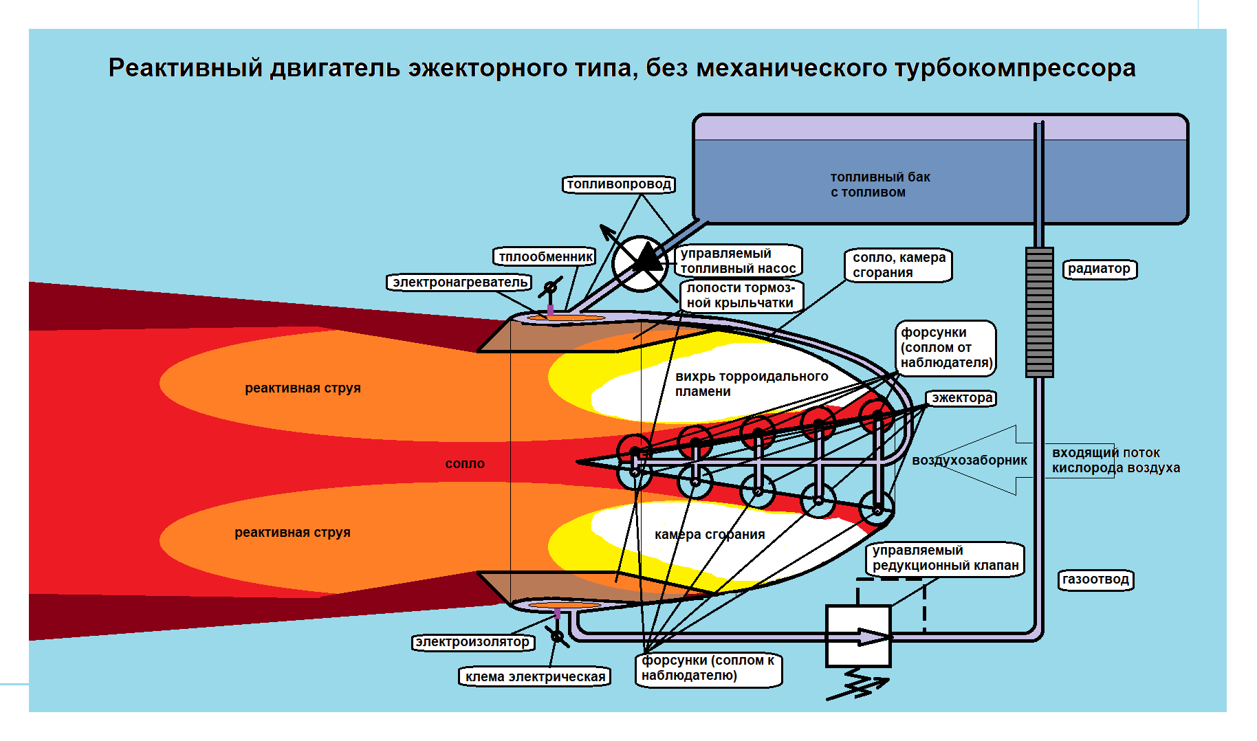 Двигатель лишенный этого агрегата и связанных с ним недостатков, можно построить на основе эжекторов, которые под действием раскаленной струги паров топлива высокого давления (10 - 50 - 300 атмосфер и выше) увлекают за собой кислород воздуха из воздухозаборника, направленные таким образом, что бы создавать торрообразное, вихревое пламя в камере сгорания, которое в этом случае может являться соплом, так как в торре удлиняется пробег горящей смеси, дающей возможность полному сгоранию топлива, тем более, что следующий виток поджигает предыдущий.