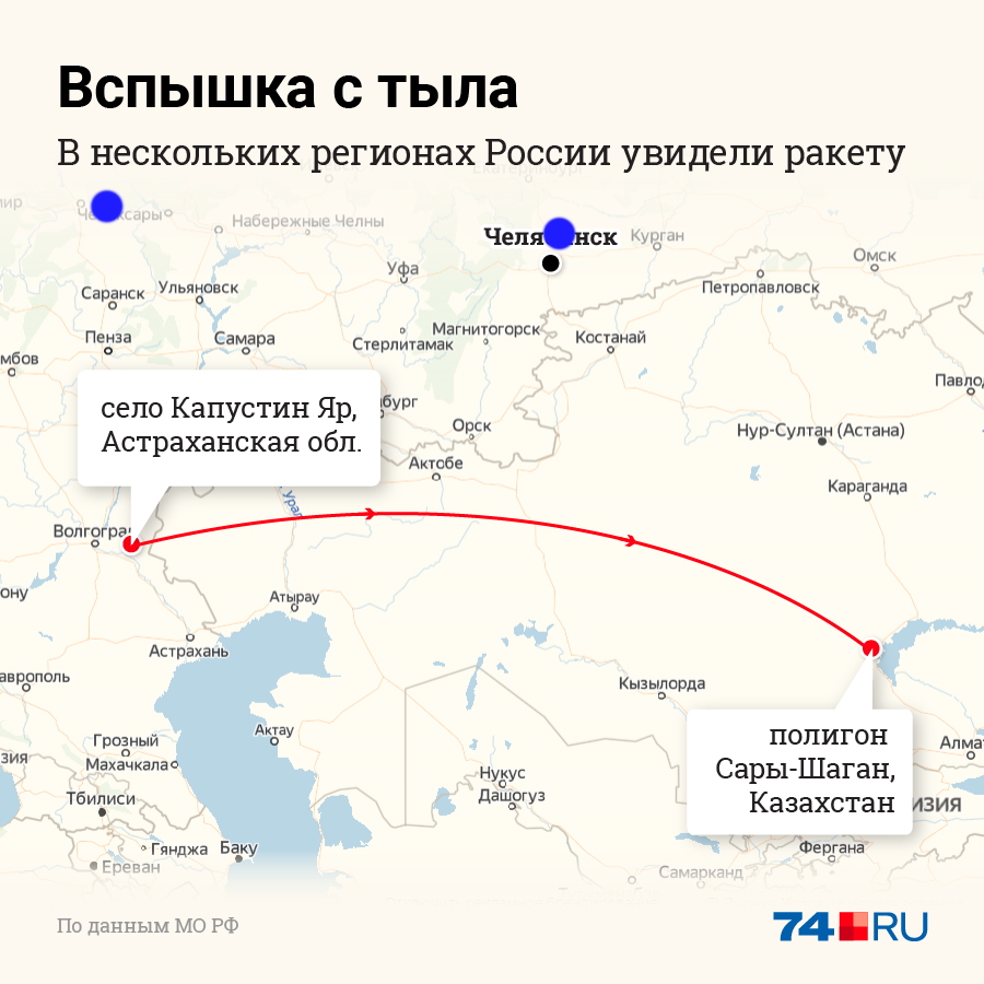 Как раз, напротив Челябинска у ракеты закончилось топливо, она отбросила последнюю ступень, сделала разворот и дальше болванки полетели по баллистической дуге... что и подтверждает видео выше.