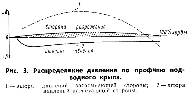 Поток, набегающий на крыло со скоростью υ под некоторым положительным углом атаки α, на верхней стороне профиля ускоряется, а на нижней замедляется. При этом, согласно закону Бернулли, давление на верхней стороне уменьшается, а на нижней увеличивается (по сравнению с давлением в невозмущенной жидкости). Образование эффекта кавитации так же в некоторых случаях указывает на зону пониженного давления.