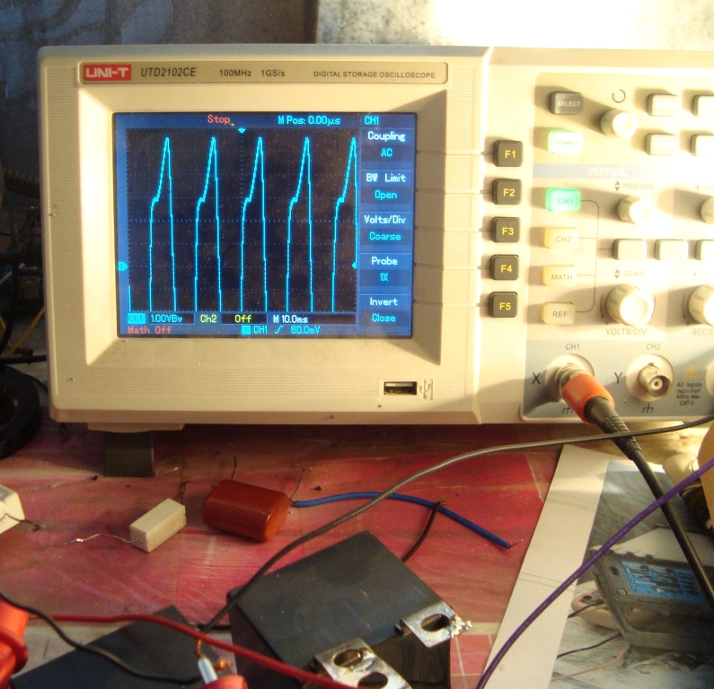 В положительной полуволне происходит цикл формирования энергии на конденсаторе , но разряда конденсатора нет(ну ,или я его не вижу).