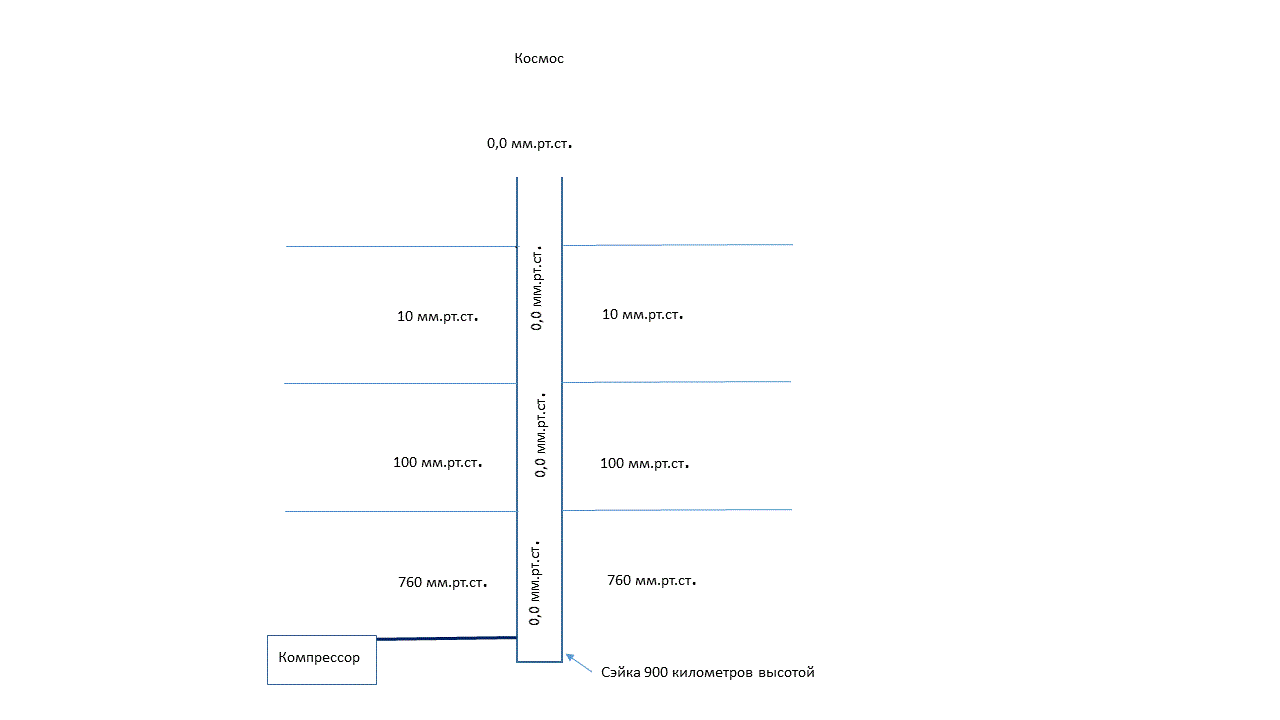 Это для аналогии. На картинке вакуумный Сэйка. Я выбрал высоту Сэйка 900 км и по рисунку видно, что вершина его находится в космическом вакууме. Для того чтобы вакуумировать Сэйка можно применить (компрессор) вакуумный насос, тогда Сэйка будет подниматься в космос, как лифт.