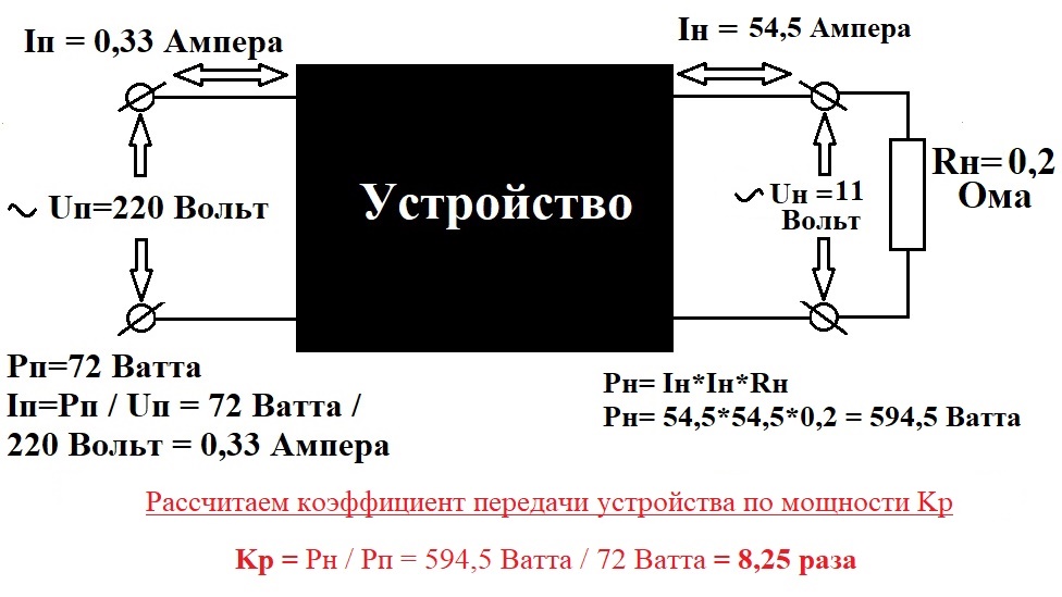 Устройство Valeralap-а увеличивает подводимую к нему мощность в 8,25 раза! Устройство потребляет из розетки 72 Вт, а выдаёт в нагрузку 594,5 Вт!